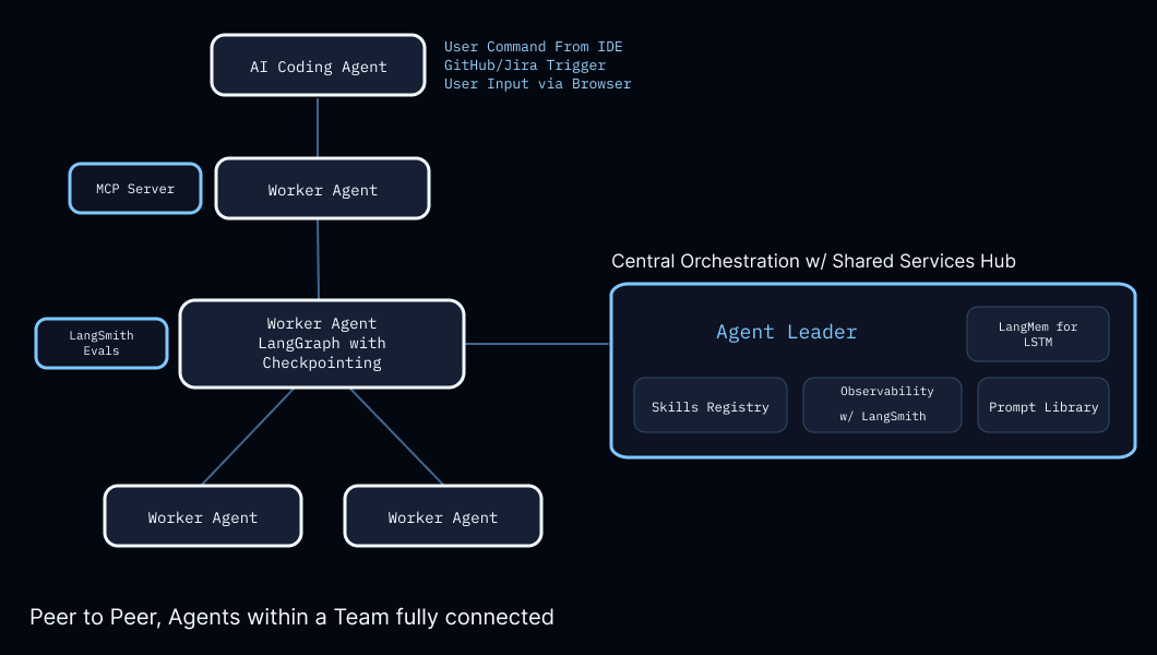 This blog describes an agentic engineering system designed to transition from task level execution to system-level collaboration. We propose a reference architecture and a pilot evaluation of a multi-agent coordinated framework implemented using LangChain’s suite of tools—including LangSmith and LangGraph. What this system is not is a “better coding AI,” or a “better task assistant”. This architecture is designed to function as a control plane for multi-agent coordination, focusing on end-to-end software delivery.