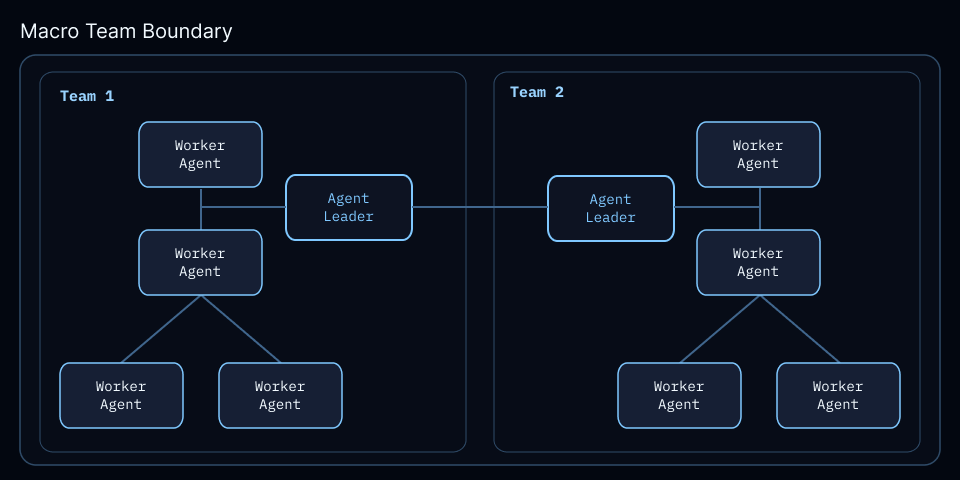Below is a reference diagram for how these agentic systems can span cross team boundaries. Agent leaders can collaborate with leaders of other teams. For instance, a product requirement coming from the product management team can be routed by the engineering team leader to the right worker agent (swarm) for planning and extracting requirements.