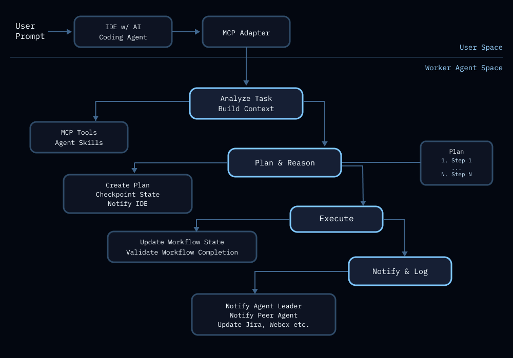 We explored several scenarios that involved agent to agent communication such as debugging technical issues with worker agents spanning across different teams and leveraging AI coding agents like codex or claude to collaborate with the worker agent for development. We detail an example of the latter scenario in the diagram below. The diagram depicts the interaction between the AI coding agent and the worker agent where the autonomous logic resides. The autonomous logic within the worker agent follows a logical four-stage progression applicable to most agentic workflows. This use case demonstrates how worker agents can be used to retrieve context that extend beyond context from source code, to notify other agents, and to trace agentic activity.