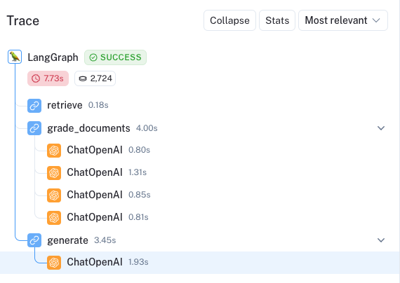 - The paper will perform a generation from each chunk and grade it twice. Instead, we perform a single generation from all relevant documents. The generation is then graded relative to the documents (e.g., to guard against hallucinations) and relative to the answer, as above. This reduces the number of LLM calls and improves latency, and allows for consolidation of more context into the generation. Of course, producing generations per chunk and grading them in isolation is an easy adaption if more control is required.