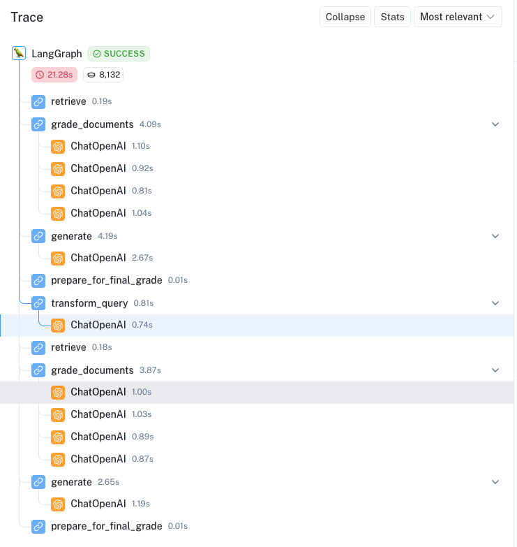 In contrast, we ask a question out of domain for the blog posts. The trace here shows that we invokes on the lower path of our conditional edge and gather supplementary documents from Tavily web search used in final generation.