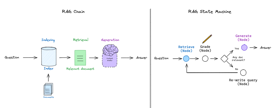 We recently launched LangGraph, which is an easy way to implement LLM state machines. This gives us a lot of flexibility in the layout of diverse RAG flows and supports the more general process of "flow engineering" for RAG with specific decision points (e.g., document grading) and loops (e.g., re-try retrieval).