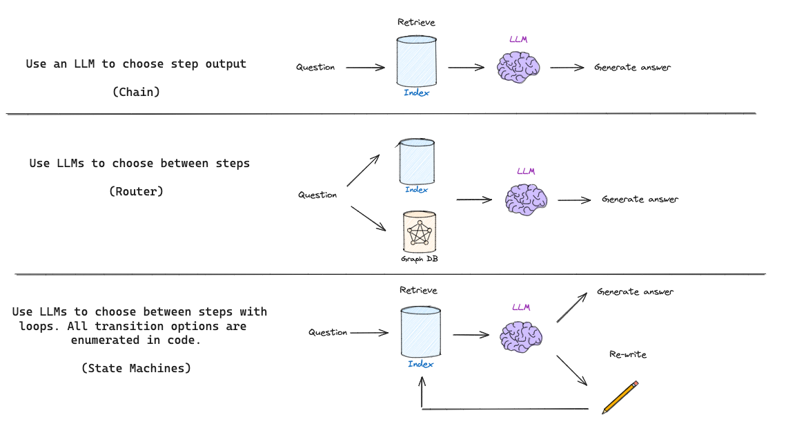 The basic RAG flow (shown above) simply uses a chain: the LLM determines what to generate based upon the retrieved documents. Some RAG flows use routing, where an LLM decides between, for example, different retrievers based on the question. But self-reflective RAG usually requires some kind of feedback, re-generating the question and / or re-retrieving documents. State machines are a third kind of cognitive architecture that supports loops and it well suited for this: a state machine simply lets us define a set of steps (e.g., retrieval, grade documents, re-write query) and set the transitions options between them; e.g., if our retrieved docs are not relevant, then re-write the query and re-retrieve new documents.