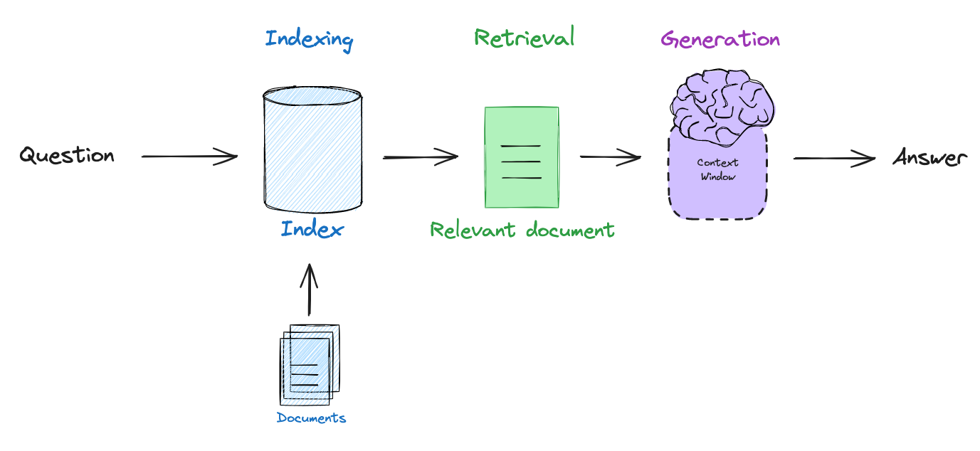 Because most LLMs are only periodically trained on a large corpus of public data, they lack recent information and / or private data that is inaccessible for training. Retrieval augmented generation (RAG) is a central paradigm in LLM application development to address this by connecting LLMs to external data sources (see our video series and blog post). The basic RAG pipeline involves embedding a user query, retrieving relevant documents to the query, and passing the documents to an LLM for generation of an answer grounded in the retrieved context.