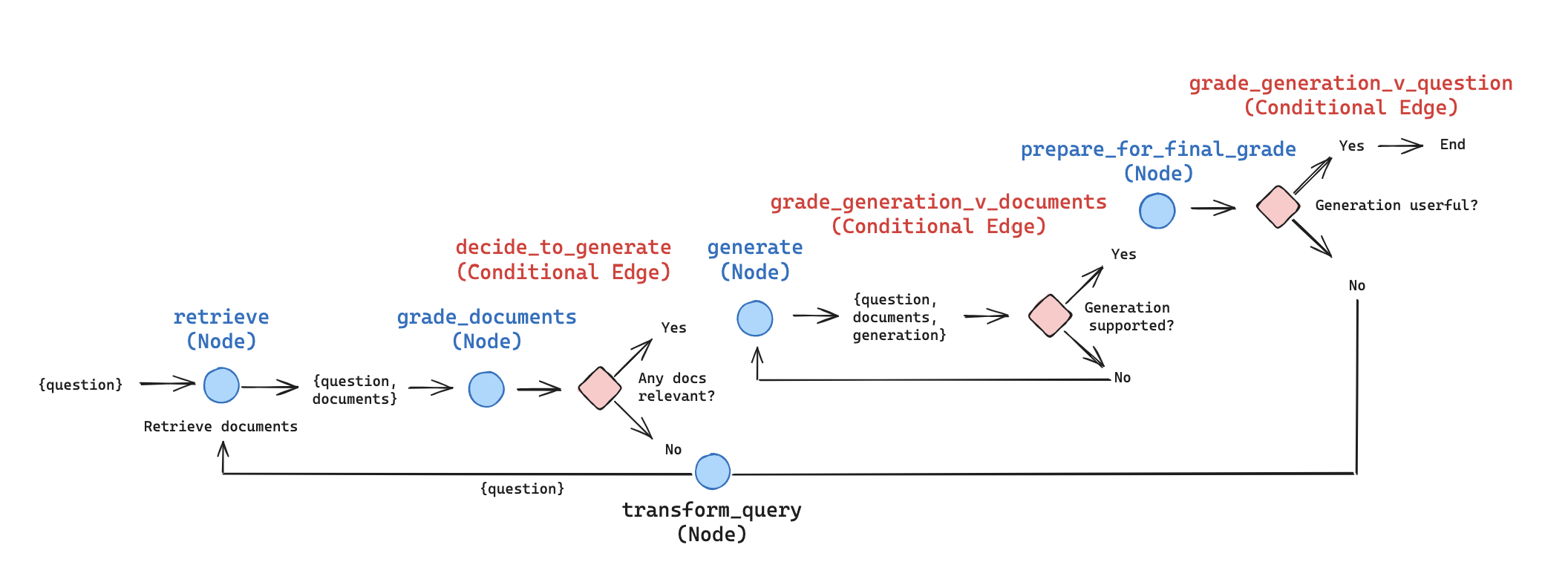 - As above, we grade each retrieved document. If any are relevant, we proceed to generation. If all are irrelevant, then we will transform the query to formulate an improved question and re-retrieve. Note: we could employ the idea above from CRAG (Web search) are a supplementary node in this path!