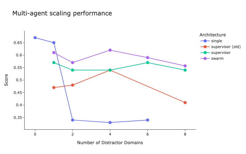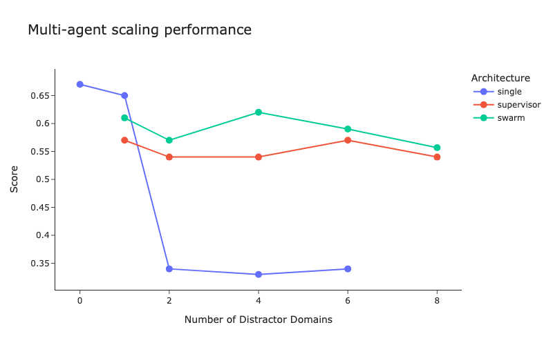 Why don’t swarm and supervisor perform as well as single agent when there is a single distractor domain? Most of the main errors were due to “translation” mistakes and degraded performance with additional context (from the handoffs). We managed to reduce them somewhat, but performance still lags behind single agent. What can be done to increase performance to that level?