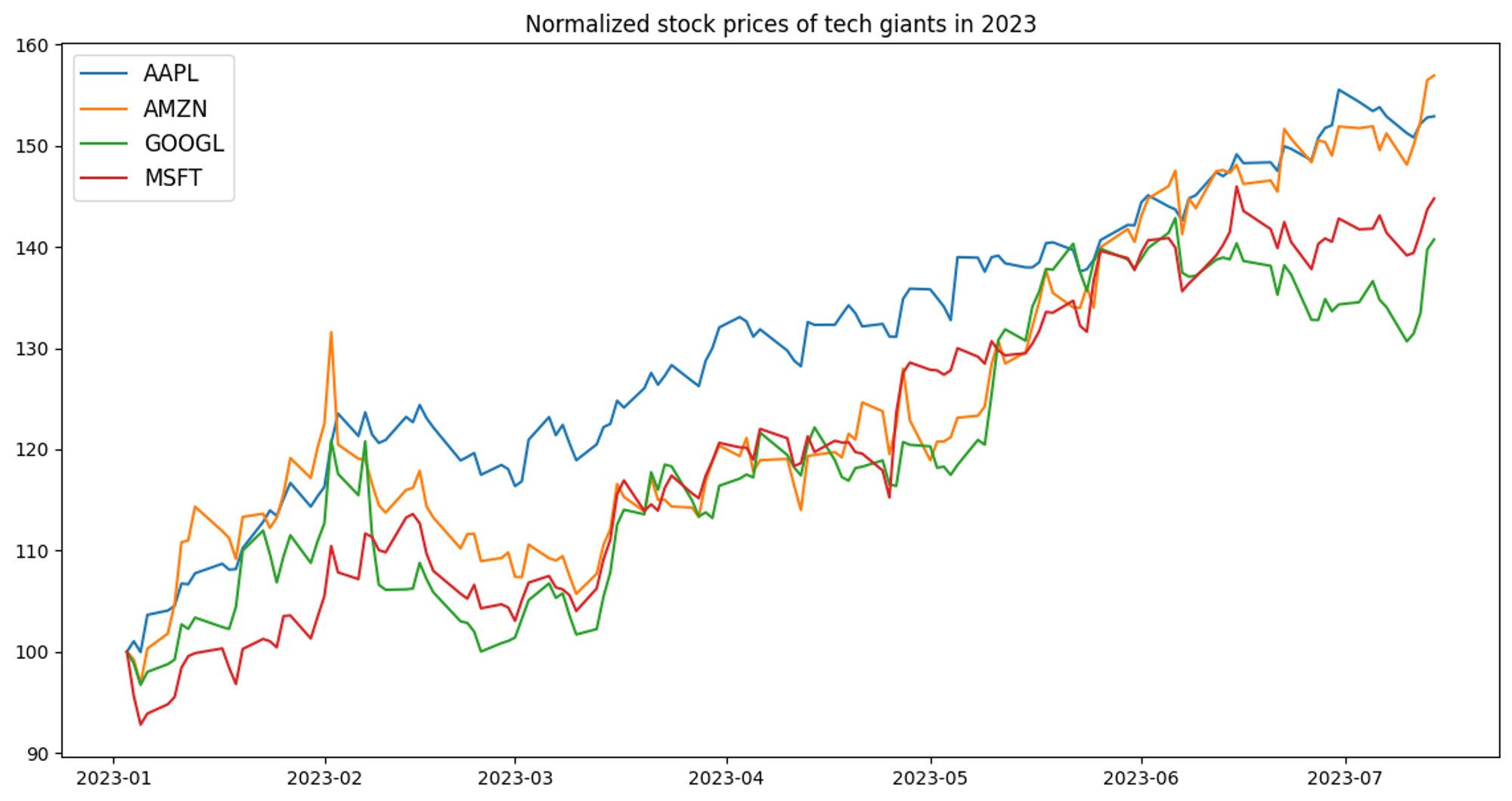 AI: Here is the normalized plot showing the relative performance of the tech giants (Apple, Google, Microsoft, Amazon) in 2023. The plot is normalized so that the starting point of each stock is 100, which allows for easy comparison of the percentage changes in each stock's price over the period.