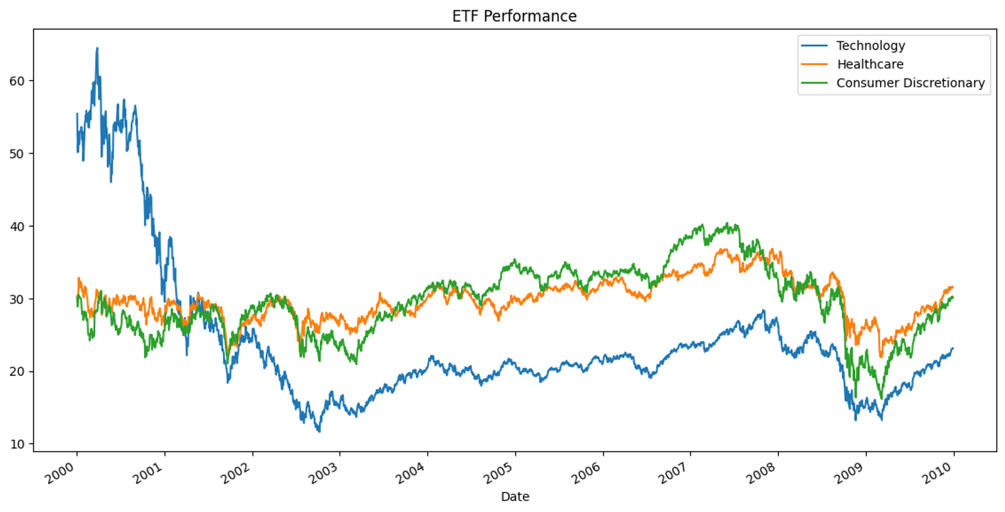 AI: The plot above shows the performance of the selected ETFs representing the Technology, Healthcare, and Consumer Discretionary sectors during the last two economic cycles (the dot-com bubble from 2000-2002 and the financial crisis from 2007-2009).