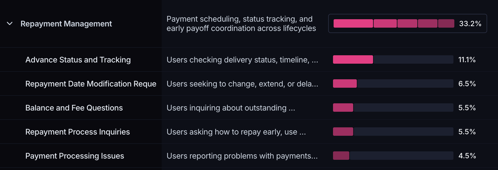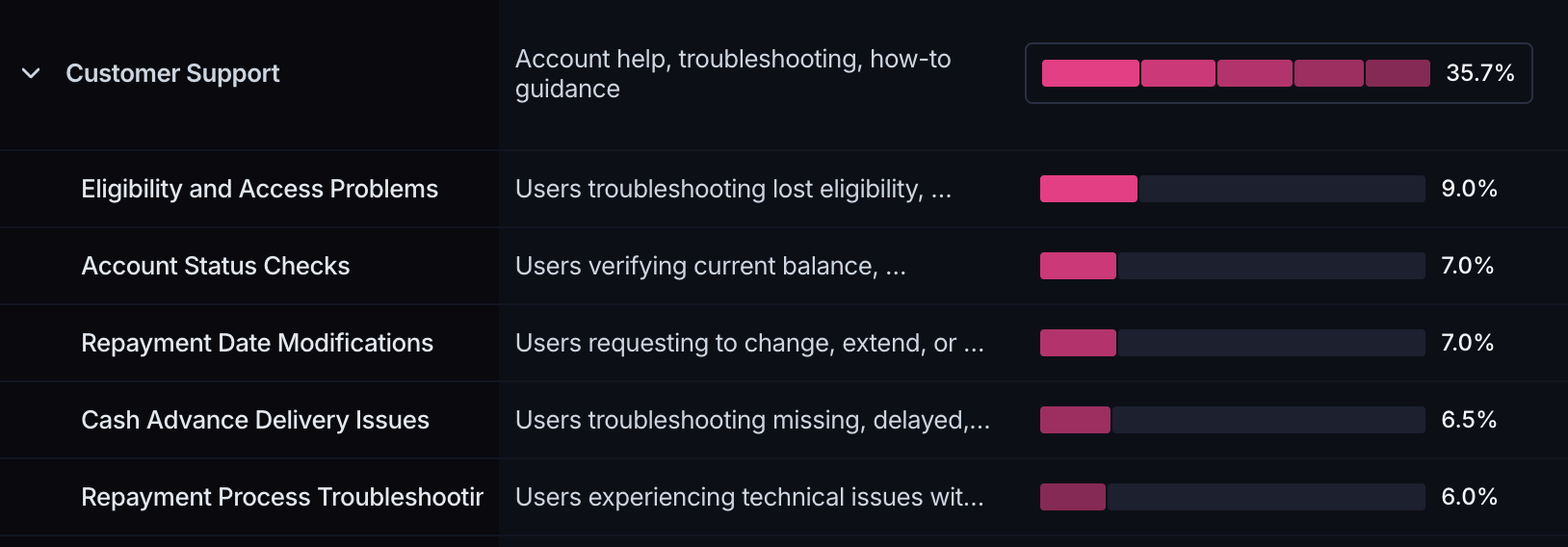 A deeper dive into these clusters indicated that some customers reach out to AskGenie to change the repayment date of the cash advances that they received from Credit Genie. In fact, the results from the V1 configuration surfaced “Repayment Date Modifications” as a relevant subcluster and the results from the V2 configuration included a similar “Repayment Date Modification Requests” subcluster.