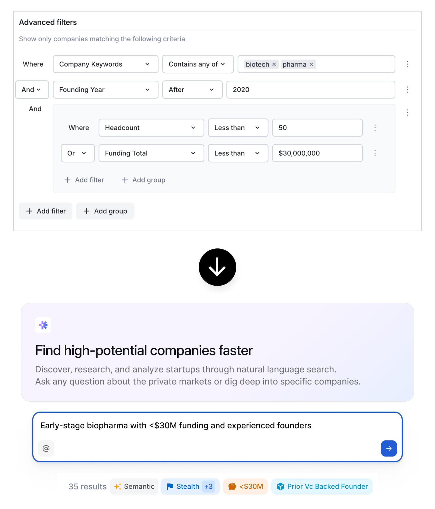 Now, investors can simply describe what they’re looking for—whether it’s a problem space, industry, a product that should exist, or a particular founder background—and Harmonic translates their natural language queries into precise, actionable search results.