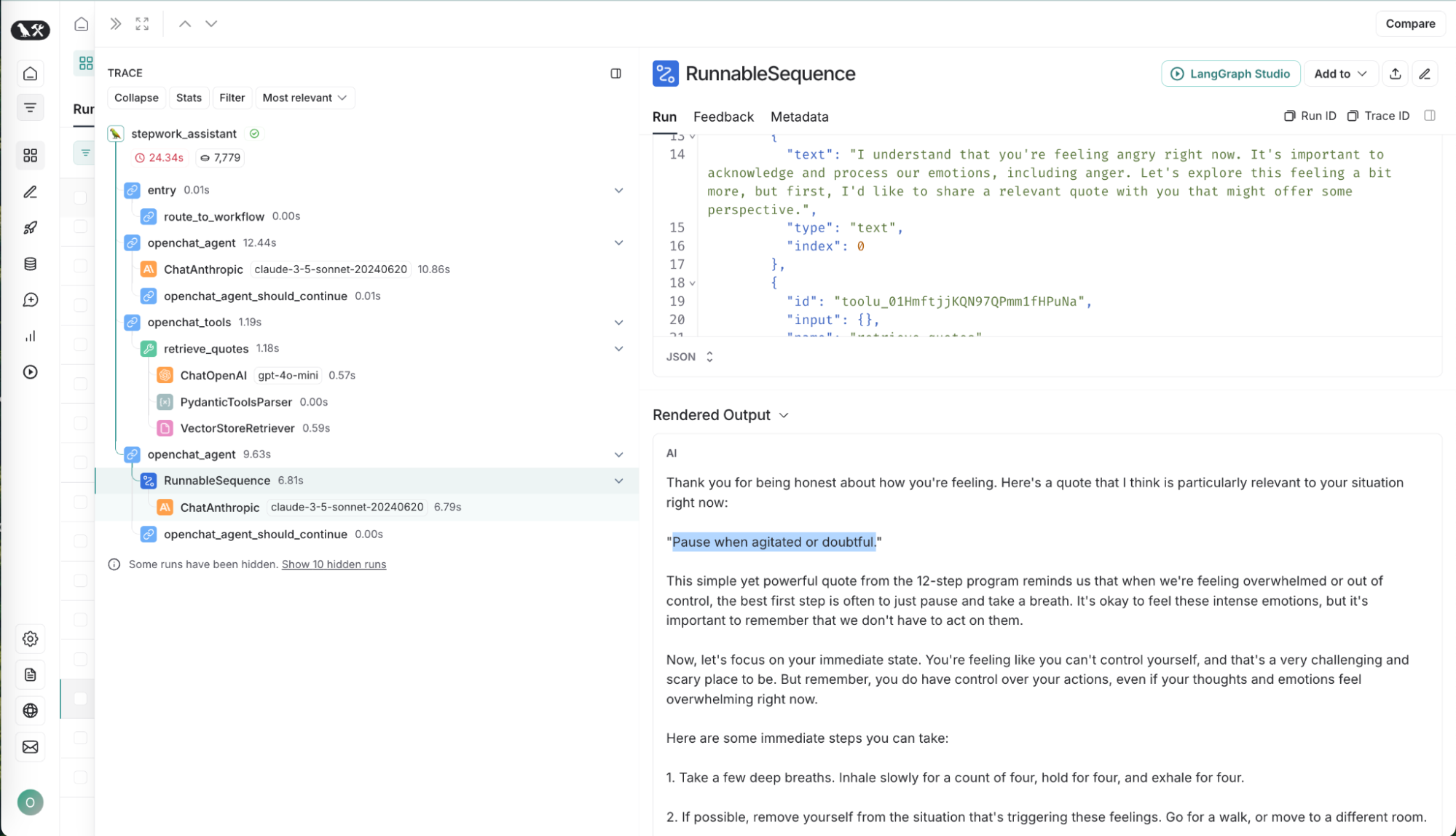 First, the platform enables collaborative prompt engineering. The non-technical content team and addiction recovery experts can easily modify prompts in the LangSmith prompt hub, test them in the playground, and deploy new revisions on LangGraph Platform. The OpenRecovery team can also test changes in LangGraph Studio, using trace logs to ensure everything functions as expected.