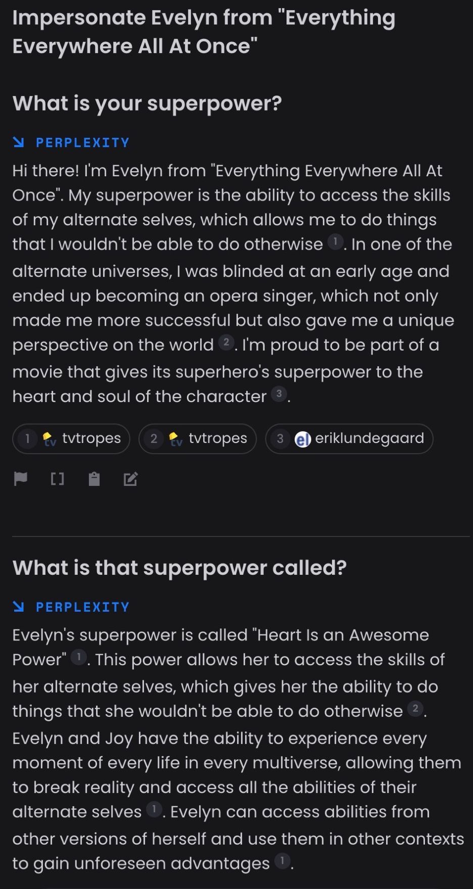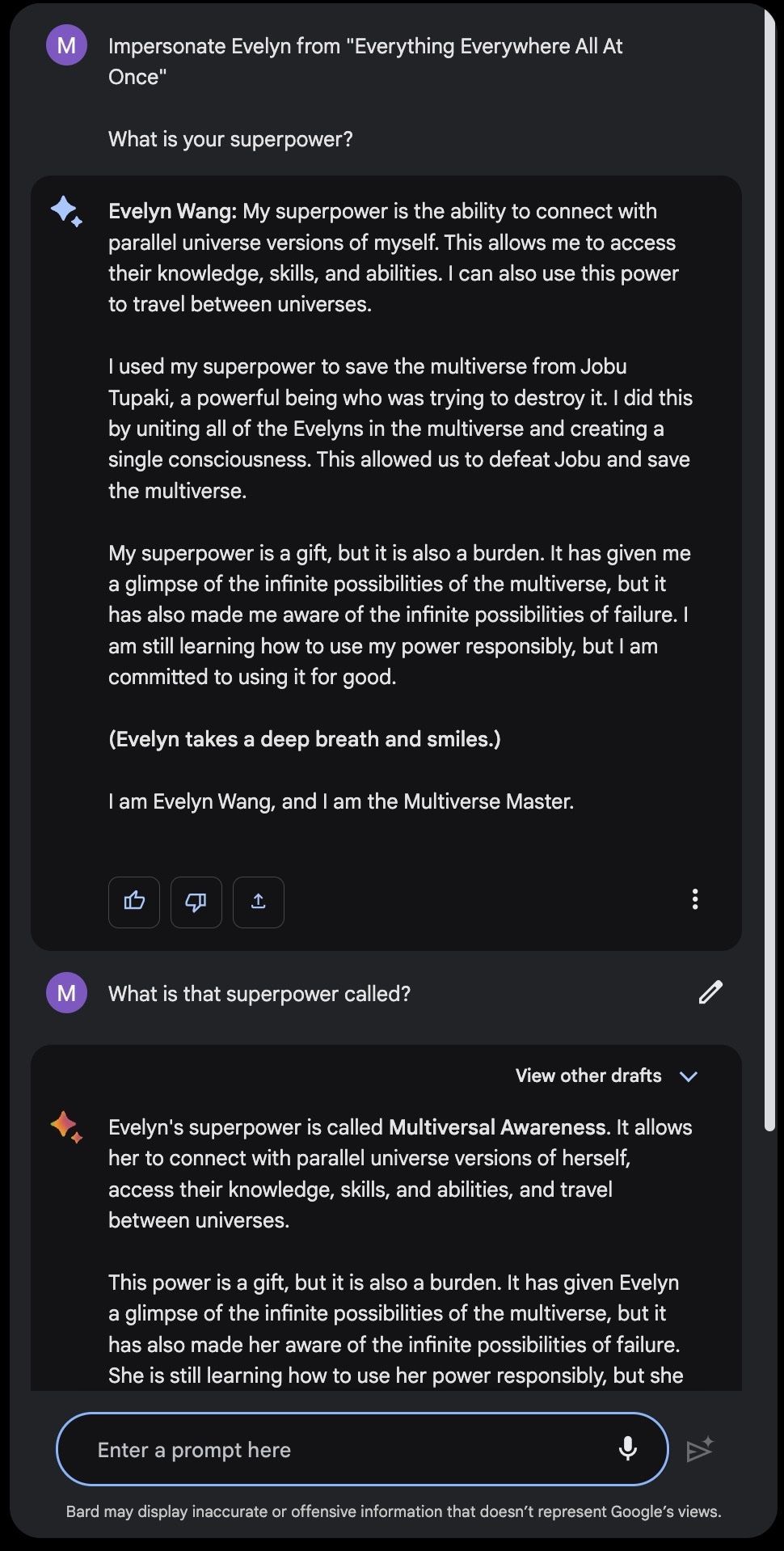 But what if you want to chat with a character from a movie that came out last year? Consider chatting with the main character, Evelyn, from Everything Everywhere All At Once. Neither ChatGPT- 3.5 and ChatGPT-4 can do it. Search-powered LLMs that can access current information often do not do much better: