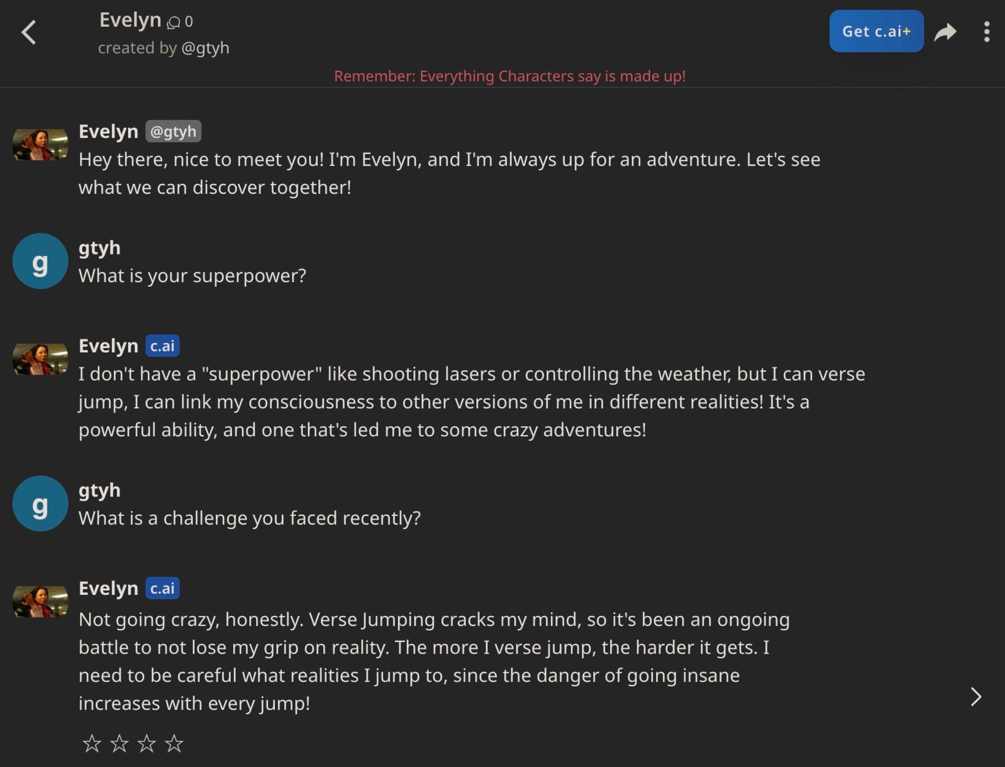 You can then export this character definition to character.ai. In fact, we have already done so: you can chat with this rendition of Evelyn on character.ai here.