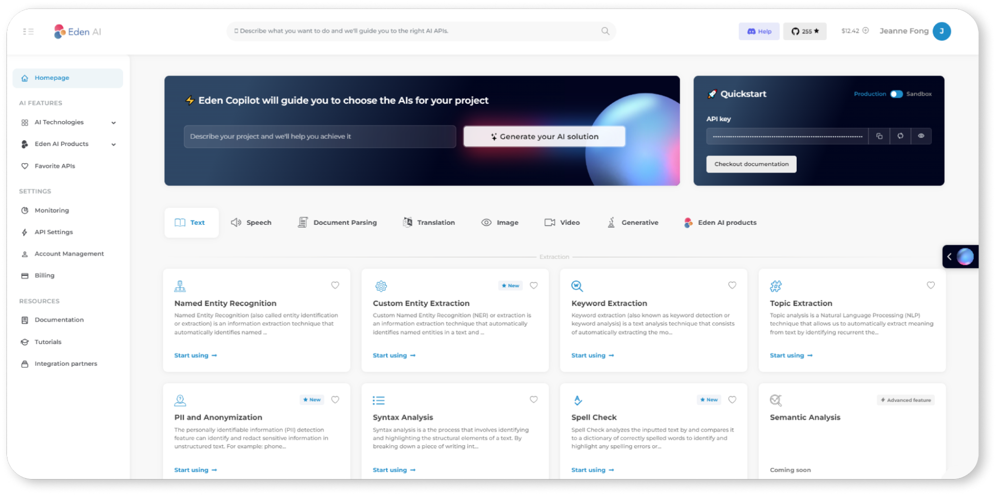 Overall, Eden AI streamlines the integration of AI, offering a user-friendly platform that simplifies the labyrinth of APIs and authentication. It grants access to a diverse range of AI capabilities, spanning text and image generation, OCR, speech-to-text, and image analysis, all with the convenience of a single API key and minimal code.