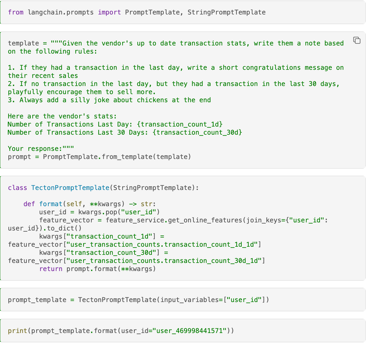 To see how this can be done, we’ve set up an example notebook showing how to connect a feature store to a prompt template. Putting it inside a prompt template allows us to nicely package up that logic and pass it through the chain. When we then call that chain, real-time information can be fetched via feast and used to construct a prompt which is then passed into the language model.