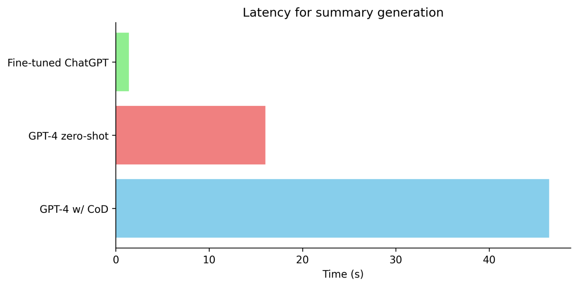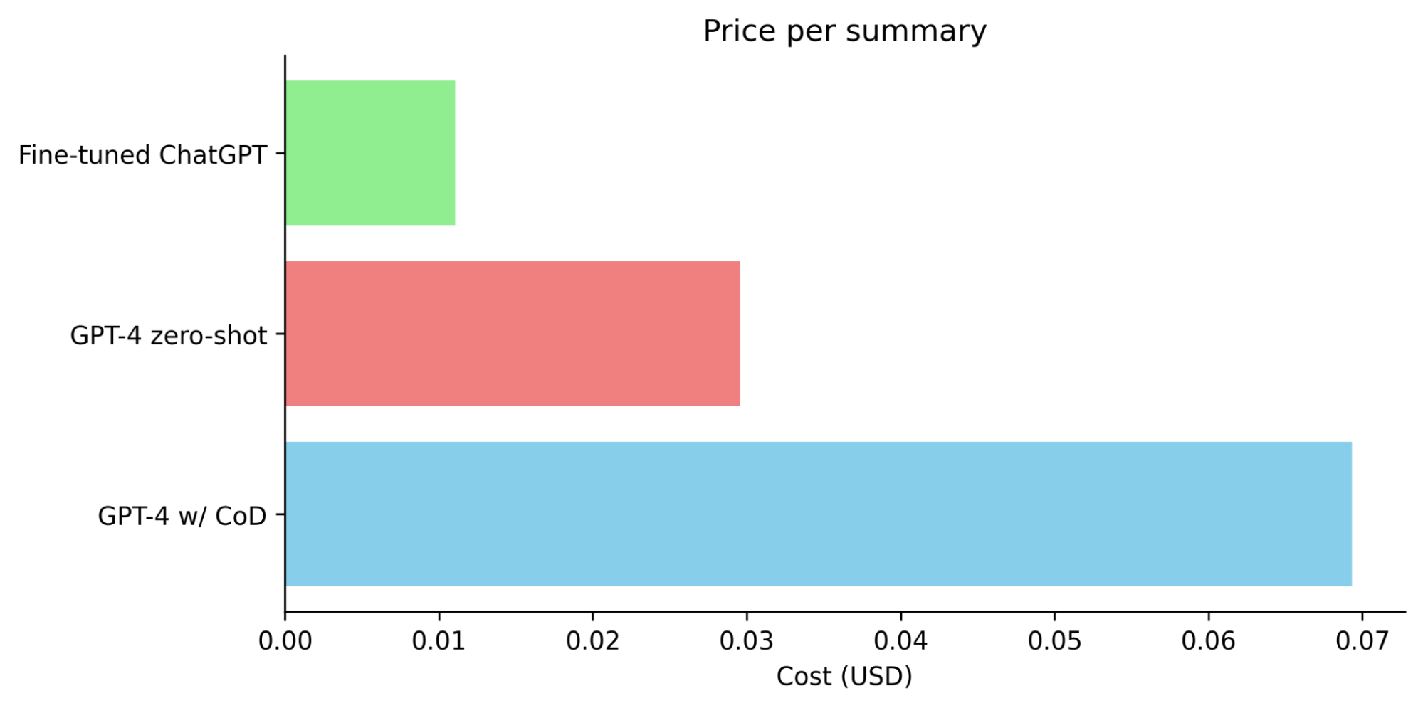 Fine-tuned ChatGPT also achieves a win rate of 96% against GPT-4 zero-shot in pairwise evaluation. In summary, while the performance of fine-tuned ChatGPT is still slightly below that of GPT-4 with chain of density prompting for summarization it far surpasses zero-shot GPT-4 while being 63% cheaper and 11x faster.