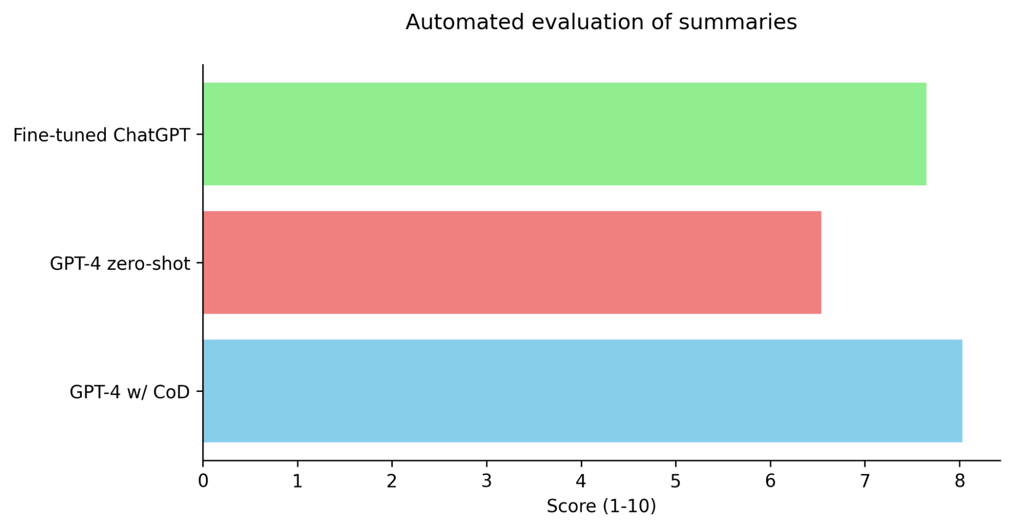 As part of this project, the PairwiseStringEvalChain has been revamped to more closely follow the LLM-as-a-judge paper. This paper introduced the automated ranking framework for Chatbot Arena. We’ve also added the 1-10 scoring method from the paper (see ScoreStringEvalChain). Both chains achieved 85% agreement with humans in the paper when using GPT-4. This is higher than the agreement between different humans. We test GPT-4 zero-shot, GPT-4 w/ CoD and ChatGPT fine-tuned on chain of density summaries. We used the same zero-shot prompt as the chain of density paper.