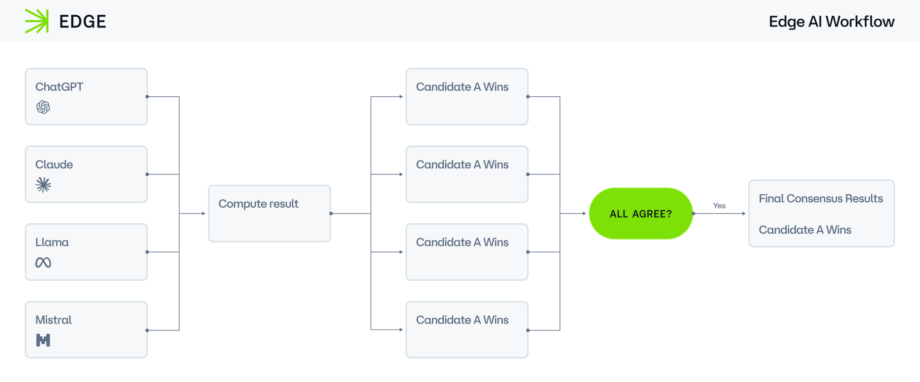 This decentralized model allows Edge AI to sidestep the limitations and bias of single-model solutions, providing a multi-perspective, bias-filtered approach to query resolution.