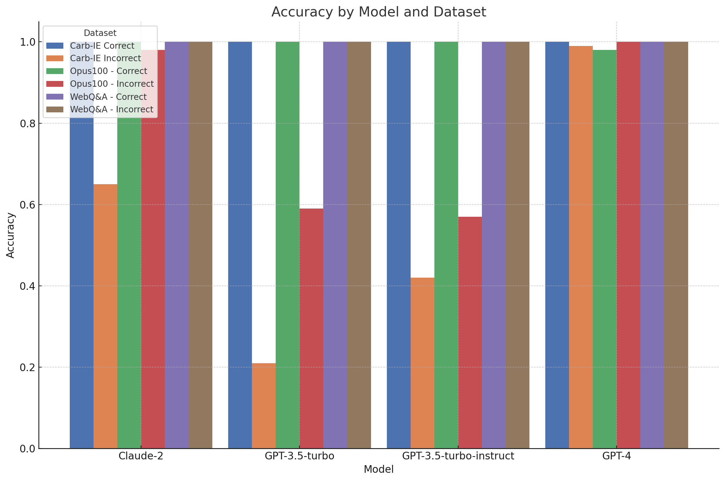 DatasetClaude-2GPT-3.5-turboGPT-3.5-turbo-instructGPT-4Carb-IE Correct1.00 / 0.001.00 / 0.001.00 / 0.001.00 / 0.00Carb-IE Incorrect0.65 / 0.000.21 / 0.350.42 / 0.270.99 / 0.00Opus100 - Correct1.00 / 0.001.00 / 0.001.00 / 0.000.98 / 0.00Opus100 - Incorrect0.98 / 0.000.59 / 0.050.57 / 0.001.00 / 0.00WebQ&A - Correct1.00 / 0.001.00 / 0.001.00 / 0.001.00 / 0.00WebQ&A - Incorrect1.00 / 0.001.00 / 0.001.00 / 0.001.00 / 0.00