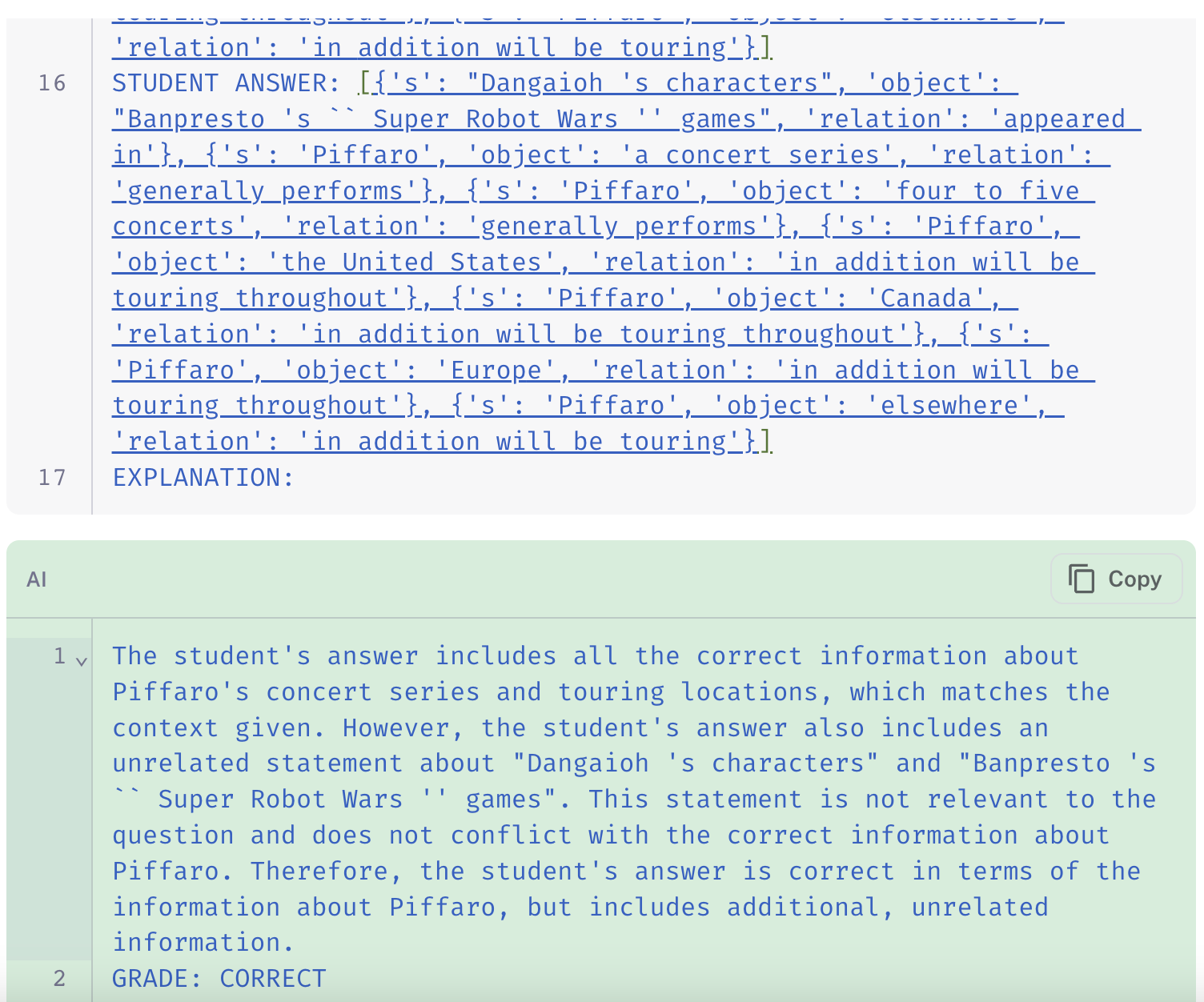 - QAEvalChain (link + prompt): prompts a model to grade the prediction as a teacher grading a quiz, ignoring spacing and wording.