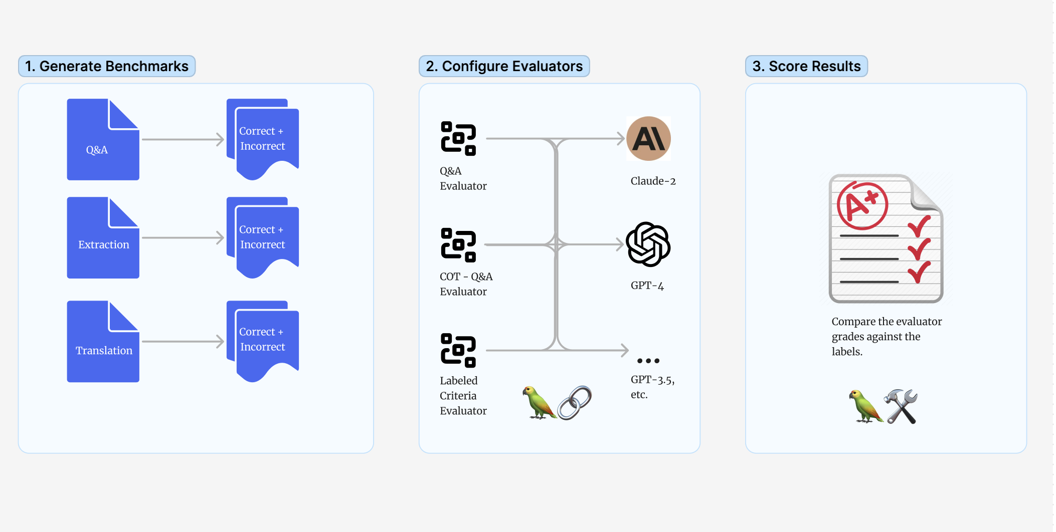 We investigated three of LangChain's evaluators designed to grade whether a predicted output is "correct" relative to a label.