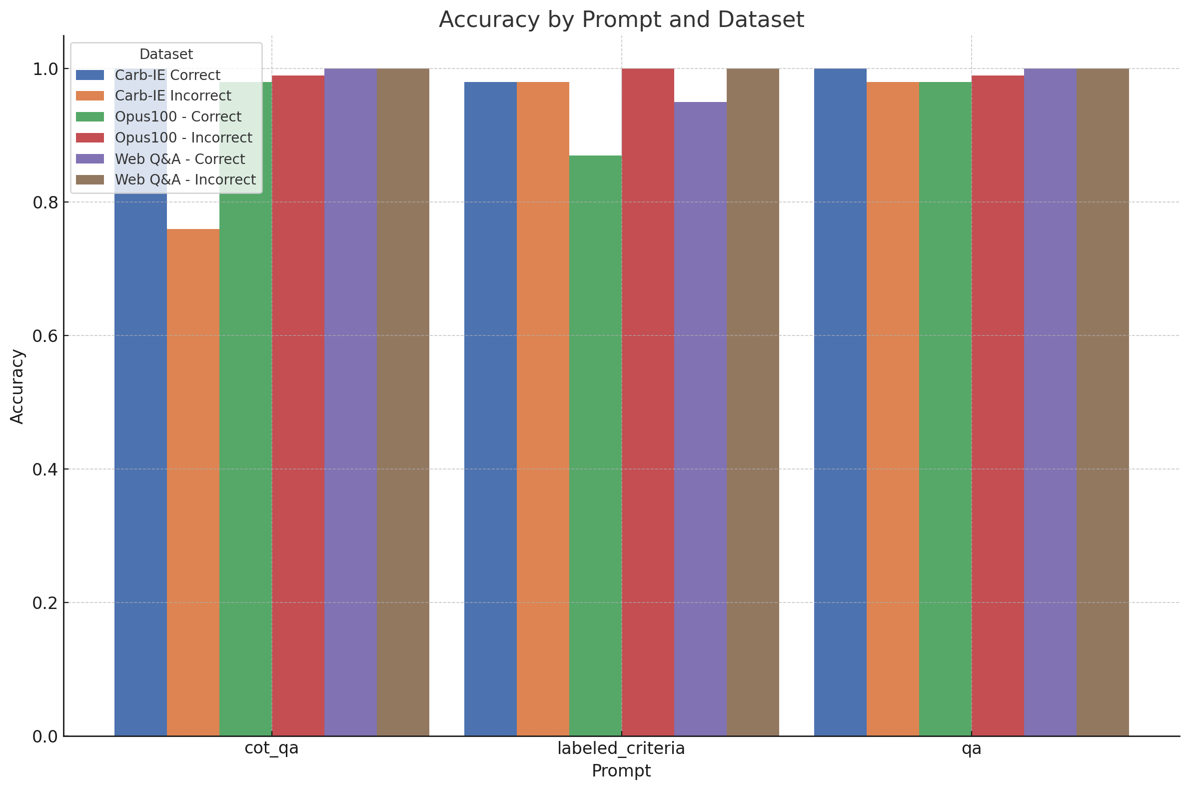 The default "qa" prompt most consistently produced the expected answers, especially when compared to the chain-of-thought QA evaluator and the general criteria evaluator. In the Carb-IE Incorrect split, which tests the correctness of extracted knowledge triplets, the chain-of-thought QA evaluator underperformed significantly. It failed to penalize for extra, irrelevant triplets, revealing the limitation of applying a general "quiz-style" prompt to specialized tasks if without providing additional information.