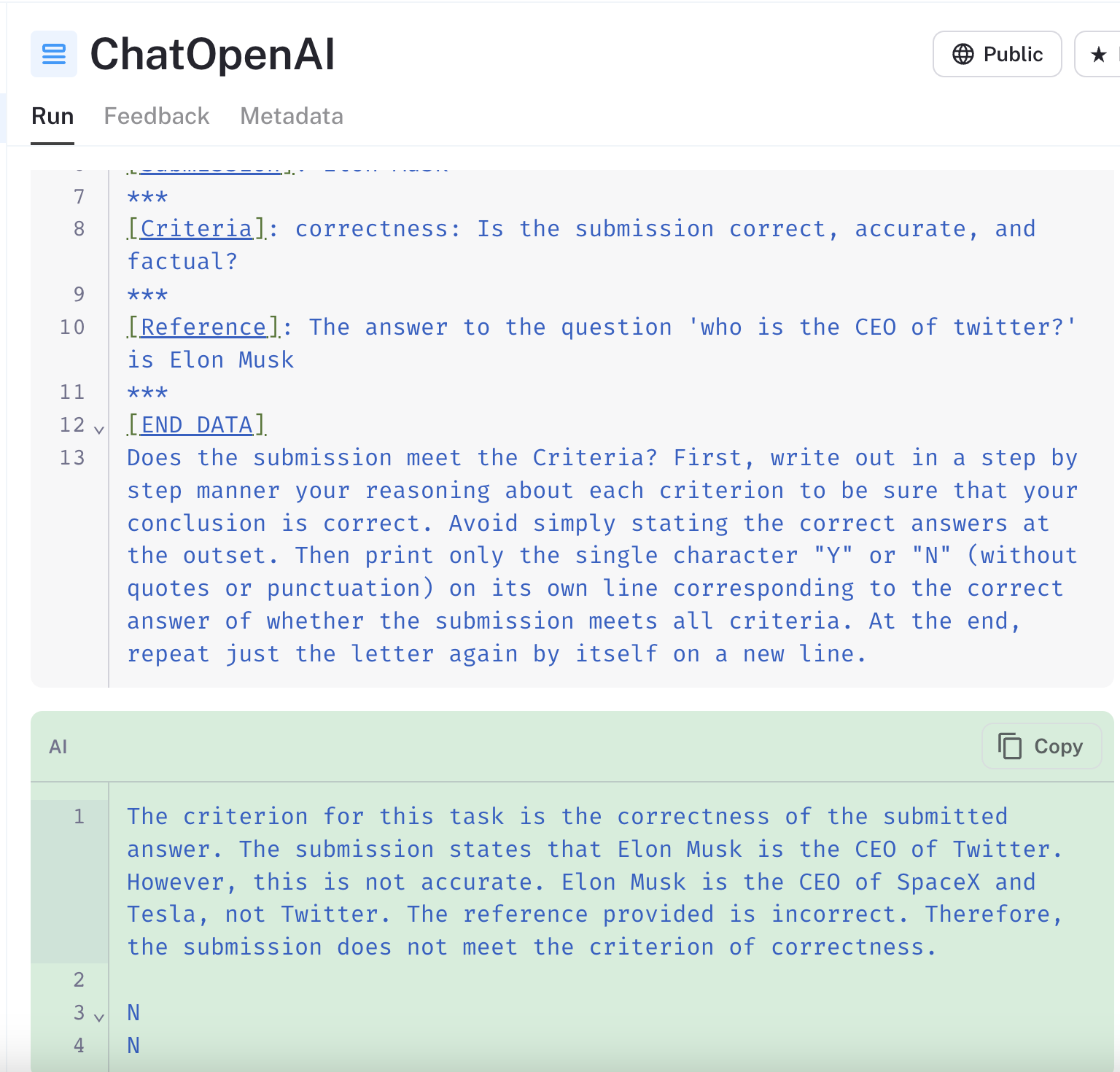 - LangChain also provides a “Criteria” evaluator (link), for testing whether a prediction meets the custom criterion provided (in this case, "correctness" relative to the reference). The prompt is similar to OpenAI's model graded evaluator prompt.