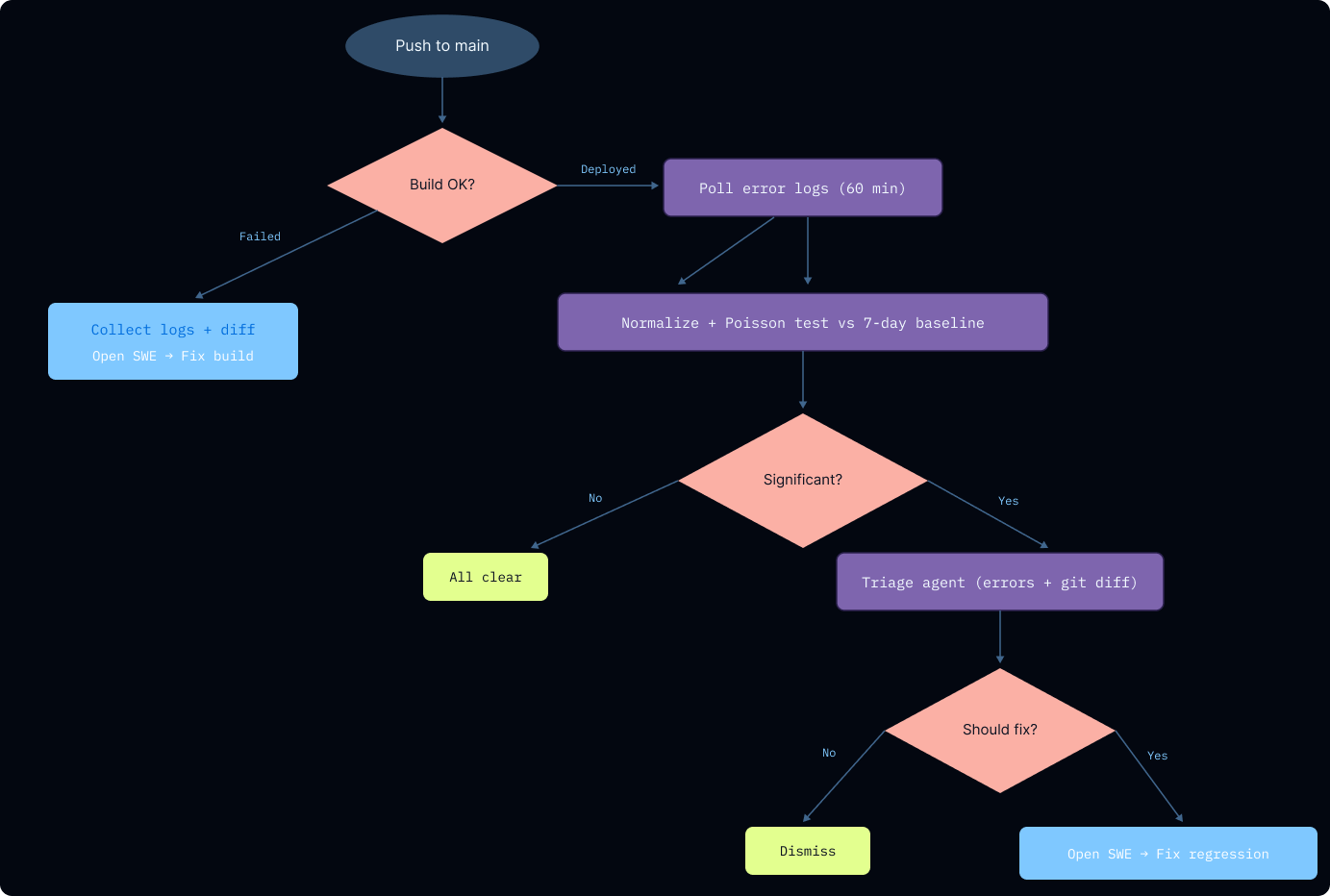 With coding agents, the hard part of shipping isn't getting code out. It's everything after: figuring out if your last deploy broke something, investigating what caused the issue, and fixing it before users notice. I wanted to deploy, move on, and trust that if something regressed, the system would catch it and close the loop itself.