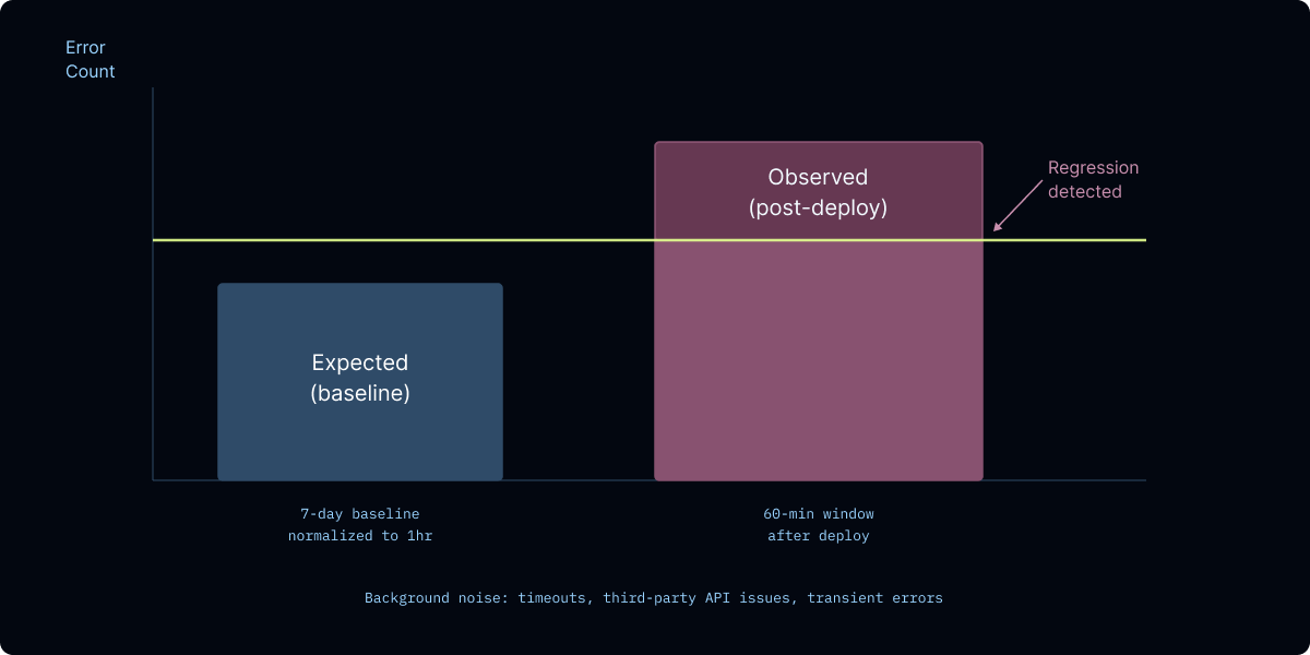 Server-side issues are trickier than build failures. A production system carries a background error rate—network timeouts, third-party API issues, transient failures, etc. In an ideal world you'd track and fix every single one, but when trying to answer "did my last deploy break something," you need to separate the errors your change caused from the noise that was already there. That's what this step does.