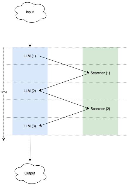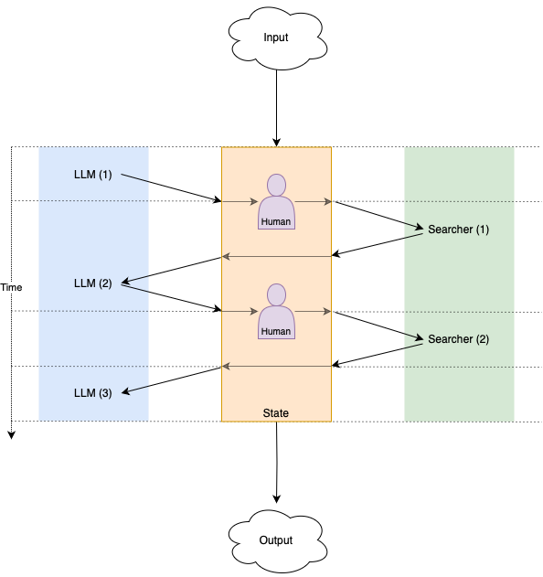 As each actor hands off work to another (eg. an LLM prompt asking a search tool for results on a query) we need to make sense of the back-and-forth between multiple actors – what order does it happen in, how many times is each actor called, etc. To do this we can model the interaction between the actors as happening across multiple discrete steps, when one actor hands off work to another actor, that results in the scheduling of the next step of the computation, and so on, until no more actors hand off work to others, and we’ve reached the final result.