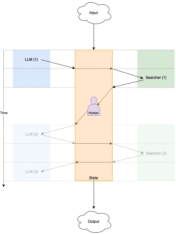 Communication across steps implies updating of some state, otherwise when you call the LLM actor the 2nd time you’d get the same result as the first time. Turns out it’s very helpful to pull this state out of each of the actors, so that all actors collaborate on updating a single central state. With a single central state we can also easily snapshot it and store during or after each computation.