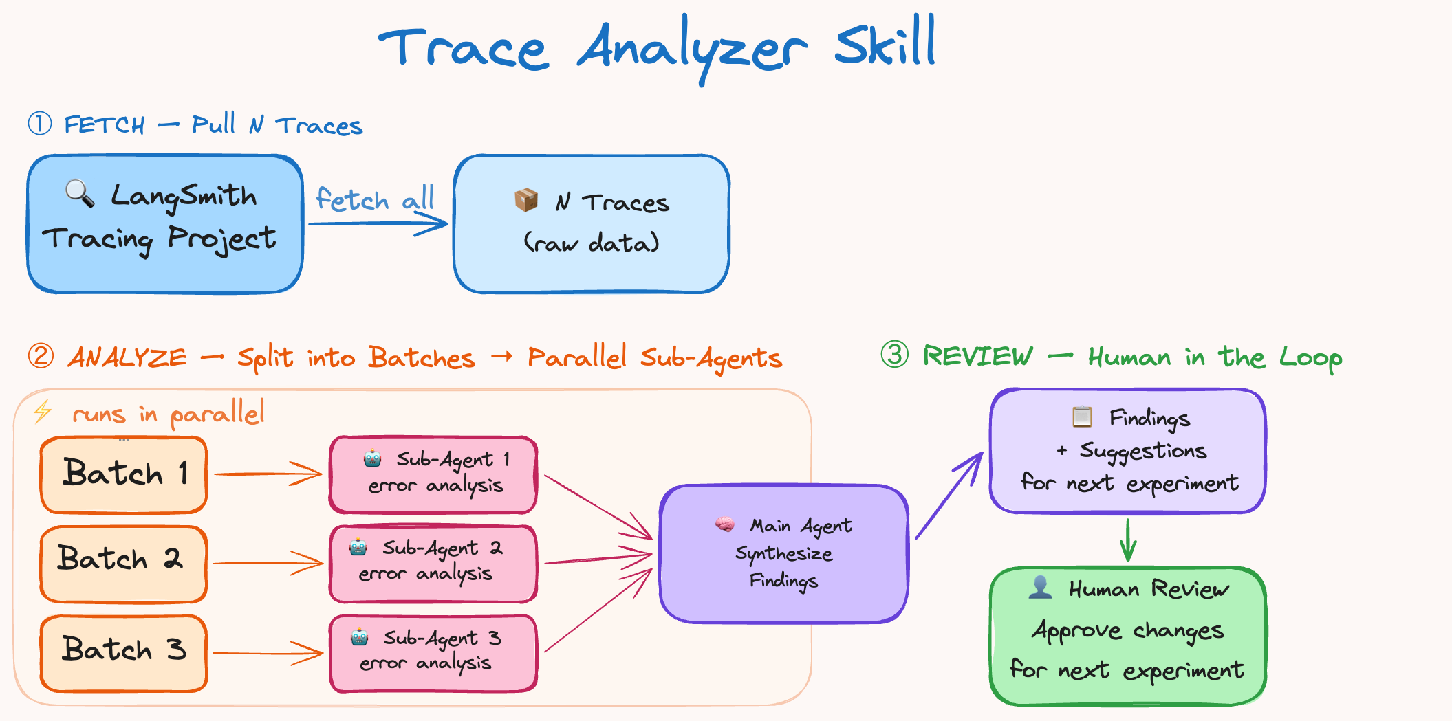 We wanted trace analysis to be repeatable so we made it into an Agent Skill. This serves as our recipe to analyze errors across runs and make improvements to the harness. The flow is: