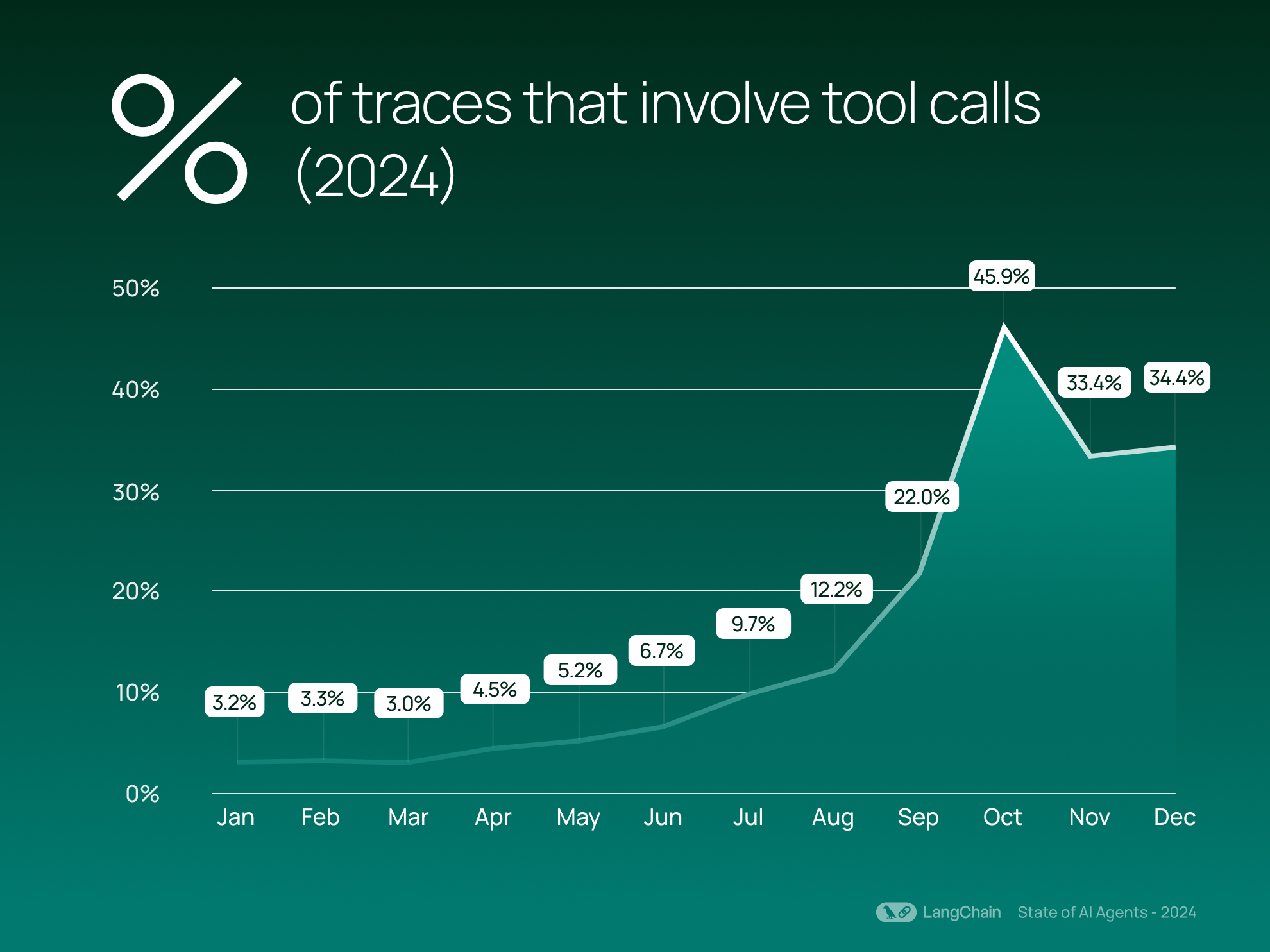 As companies are getting more serious about incorporating AI agents across various industries, adoption of our controllable agent framework, LangGraph, is also on the rise. Since its release in March 2024, LangGraph has steadily gained traction — with 43% of LangSmith organizations are now sending LangGraph traces. These traces represent complex, orchestrated tasks that go beyond basic LLM interactions.