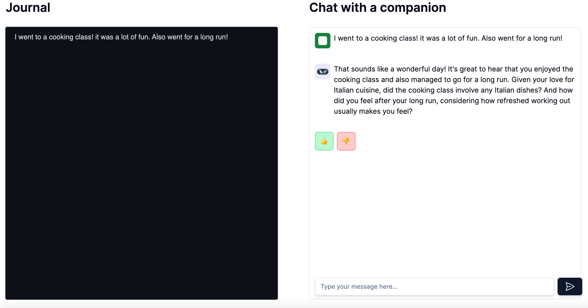 When thinking about a good use case to implement to test out long-term memory, a journaling app jumped to mind. The main reason for this is that we believed the interactions in this app would contain more relevant information to remember than a standard chat application.