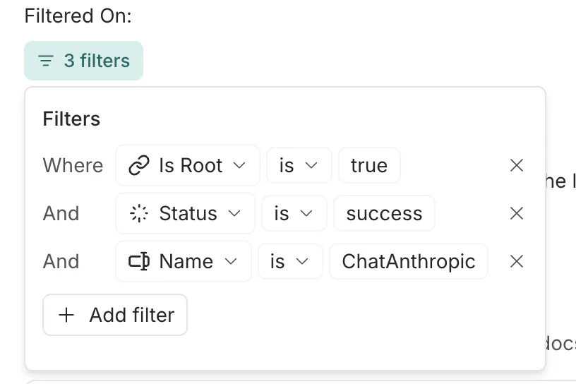 For each alert metric, you can leverage a robust set of filters to focus on specific subsets of runs (e.g., filtering by model, tool call or run type).