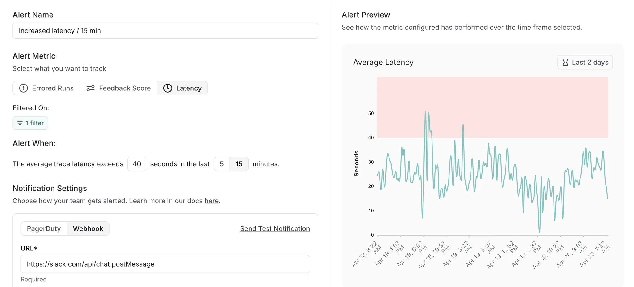 We now support setting alerts based on key metrics like error rate, run latency, and feedback scores.