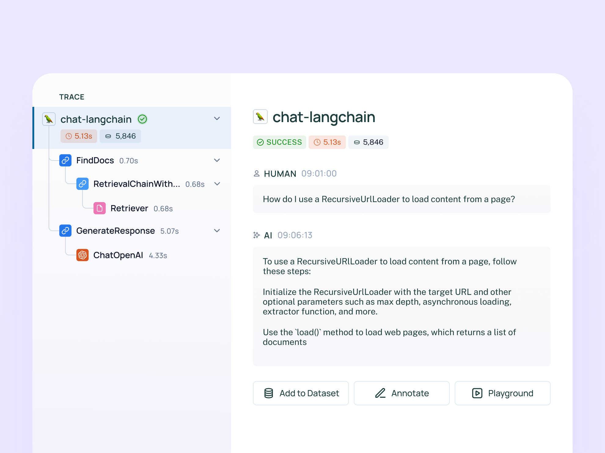 LangSmith also supports sending runs to annotation queues, which allow annotators to closely inspect interesting traces and annotate them with respect to different criteria. Annotators can be PMs, engineers, or even subject matter experts. This allows users to catch regressions across important evaluation criteria.
