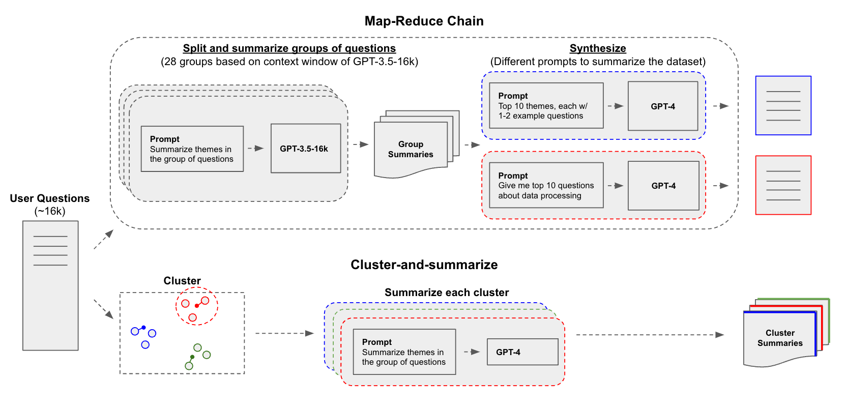 LLMs can help us summarize and identify documentation gaps from the questions collected by Mendable. We experimented with two methods to pass large question datasets to an LLM: 1) Group similar questions via clustering before summarizing each group and 2) Apply a map-reduce approach that splits questions into small segments, summarizes each, and then combines them into a final synthesis.