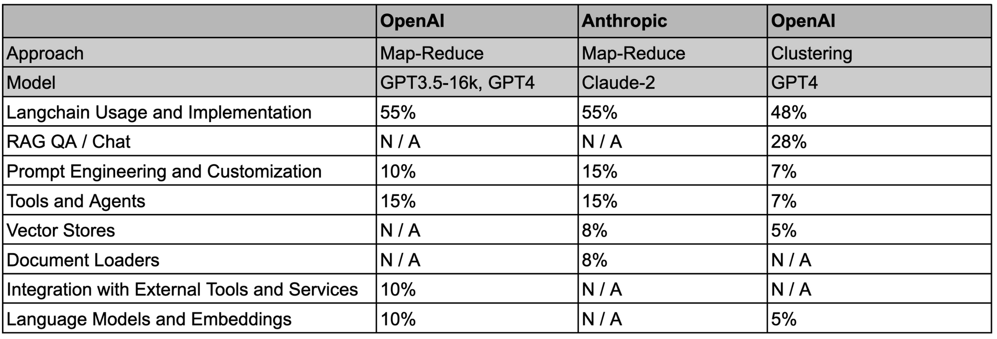 We open sourced the notebooks and the data (see repo here) so that this analysis can be reproduced. Here is a sheet with detailed results, which we summarize in the table below; we asked both methods to summarize the major question themes being asked by users with a proportion of questions that fall into each bucket: