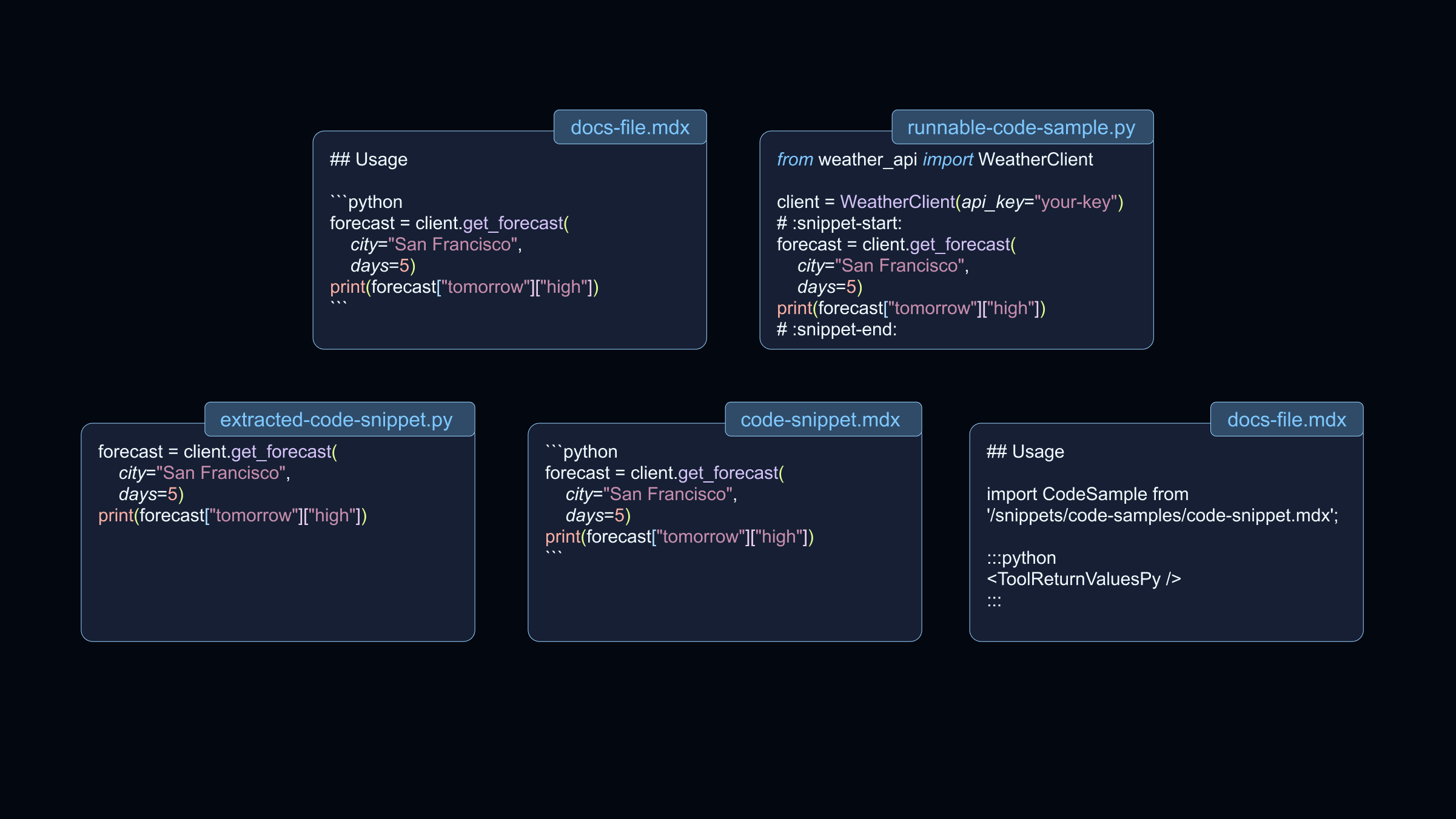 - Include the extracted code snippets as reusable snippets in the docs.