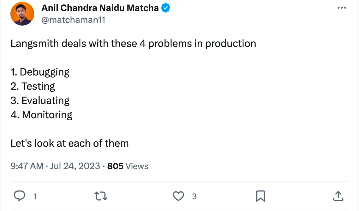 "To that end, we realized pretty early that what was needed - and missing - wasn't just an open source tool like LangChain, but also a complementary platform for managing these new types of applications. To that end, we built LangSmith - which is usable with or without LangChain and let's users easily debug, monitor, test, evaluate, and now (with the recently launched Hub) share and collaborate on their LLM applications.”