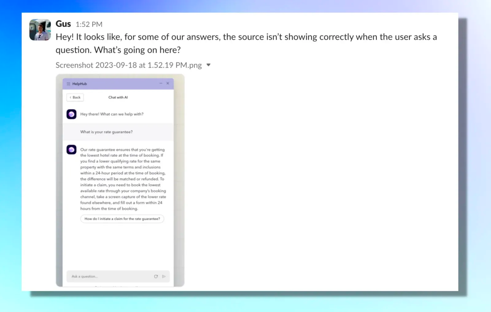 What he’s referring to in the screenshot is the fact that each prompt from HelpHub should reference the source document that it’s referencing when giving users an answer. We do this primarily to legitimize the LLMs response and give our HelpHub customer’s peace of mind that their end users are in fact getting to the help resource they need (instead of an LLM just hallucinating and giving any response it wants.)