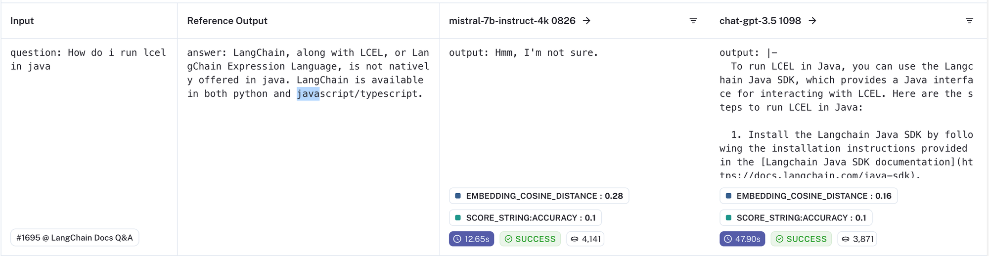 When inspecting this by eye, the gpt-3.5-turbo model clearly hallucinates, even providing a nice made-up link (https://docs.langchain.com/java-sdk). The mistral models' response is preferable, since it doesn't generate inaccuracies (no official LangChain java SDK exists).