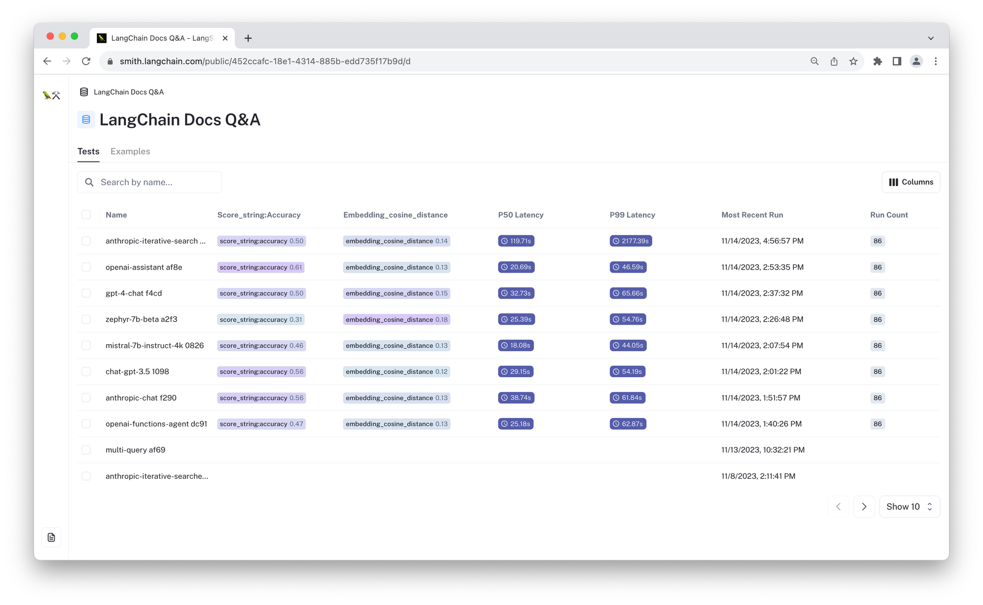 Over the past months, we've made LangSmith the best place to go for LLM architecture evaluation (test comparison view, dataset curation). Today we're making it possible to share evaluation datasets and results, to more easily enable community-driven evaluation and benchmarks. We're also excited to share the new langchain-benchmarks package so you can reproduce these results and easily experiment with your architecture.