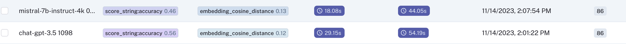 To illustrate, let's compare the conversational retrieval chain powered by Mistral-7b RAG application to similarly architected application powered by GPT-3.5: (comparison link). Using the tested prompts, GPT-3.5's performance handily outperforms the Mistral 7B model in terms of the aggregate metrics generated for this example (0.01 difference in average cosine difference but lags the average "accuracy" score by 0.1).