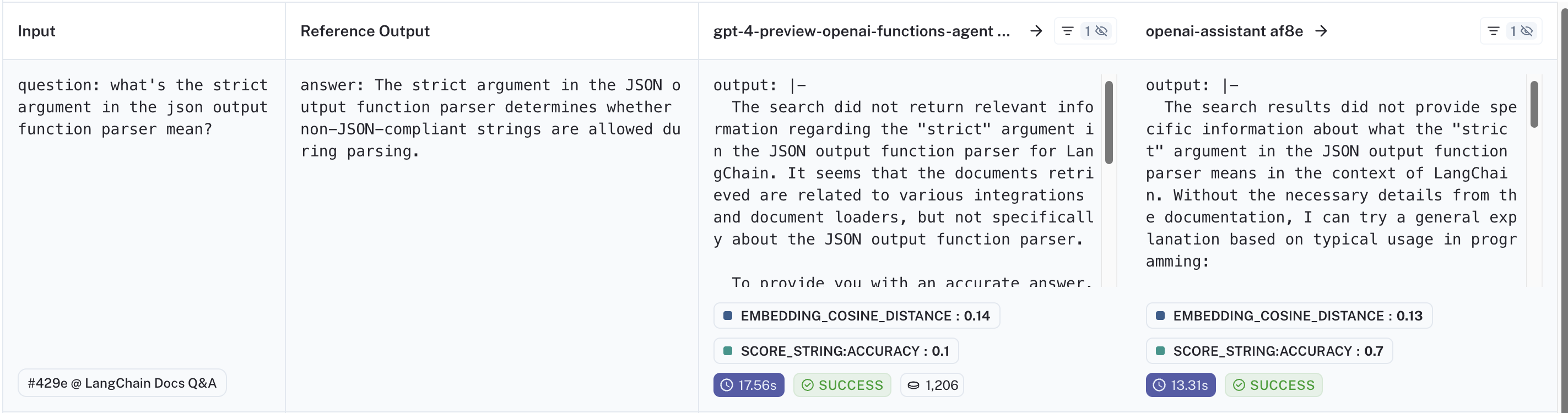Finally, let's compare the openai-assistant af83 with the similar gpt-4-preview-openai-functions-agent 5832 test. They use the same underlying model and retriever tool and work as an agent, but the former test uses OpenAI's assistant API. You can view the comparison here: link.