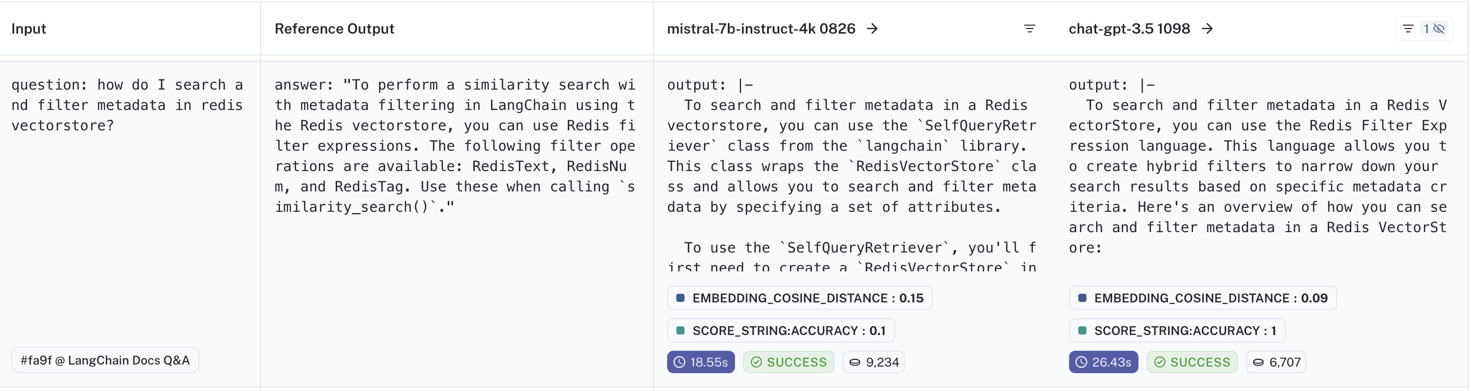 Let's review another data point, this one where gpt-3.5 responded correctly but mistral did not. If you compare the outputs, you can see that mistral was influenced too much by the document content and mentioned the class from the docs rather than the direct answer.