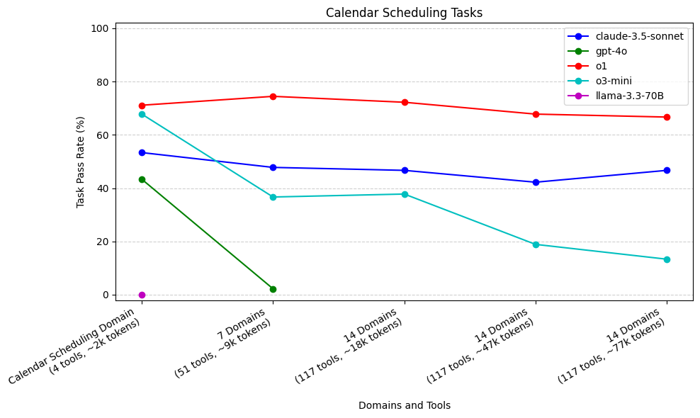 Similarly to the Calendar Scheduling tasks, gpt-4o performed worse than claude-3.5-sonnet, o1, and o3-mini across all context sizes. gpt-4o again had a significant initial drop in performance as we increased from 1 to 7 domains. llama-3.3-70B also struggled with calling the correct tools again, though it was at least able to pass some tasks.