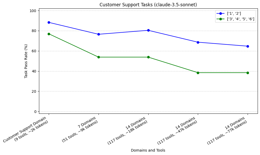 This graph compares model performance on Customer Support tasks with varying context sizes (from adding domains). Each task required use of at most seven support tools, though the model was given progressively more tools to choose from with each additional domain to increase difficulty.With more required tool calls and longer trajectories, claude-3.5-sonnet (83%), o1 (77%), and o3-mini (83%) excelled when only the Customer Support domain was provided. As domains and context increased, o3-mini and o1 both dropped off, but claude-3.5-sonnet remained relatively more stable. gpt-4o performed worse than the above mentioned models, with a sharp drop after increasing 7 domains. llama-3.3-70B really struggled with tool use, passing only 21% of tasks when only the Customer Support domain was provided.