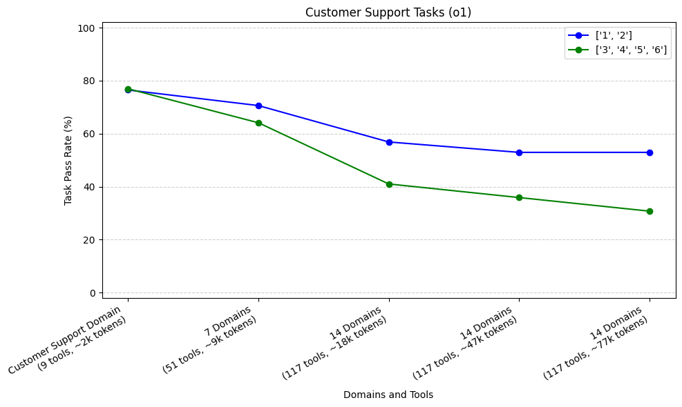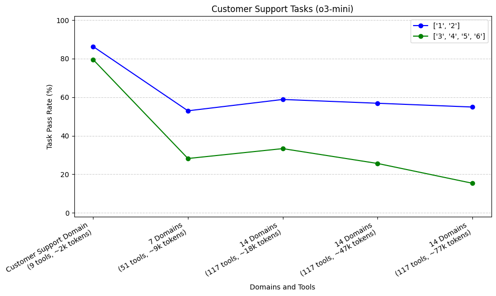 As mentioned above, Calendar Scheduling tasks didn’t require much tool calling (only two scheduling tools, and one email tool). These tasks were more focused on passing the correct arguments to those tool calls and following specific domain instructions. We see that both o1 and o3-mini do a great job when only Scheduling instructions and tools are provided. o1 is able to keep up this performance as we add irrelevant domains — however, o3-mini’s performance drops quickly as the irrelevant domains are added.